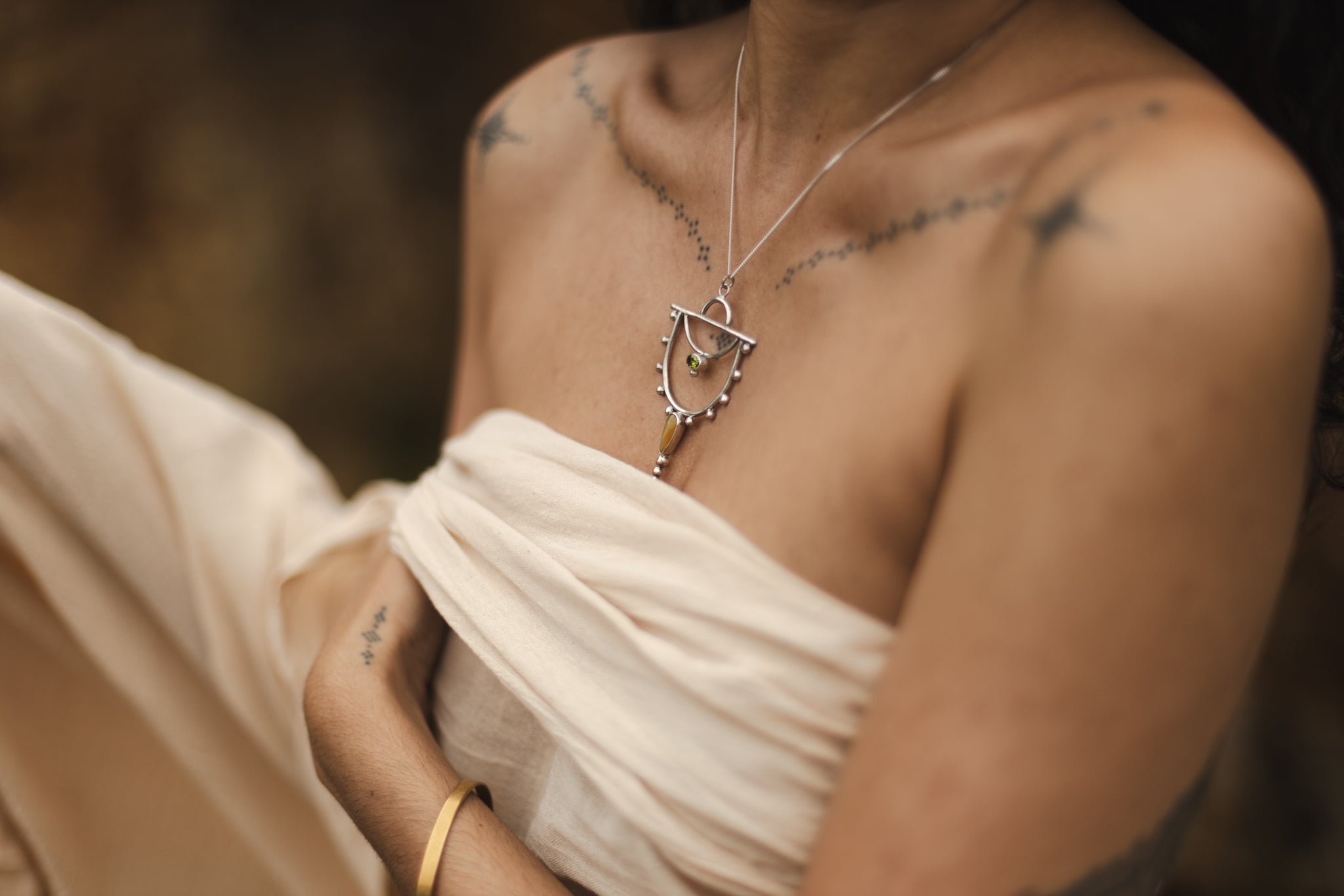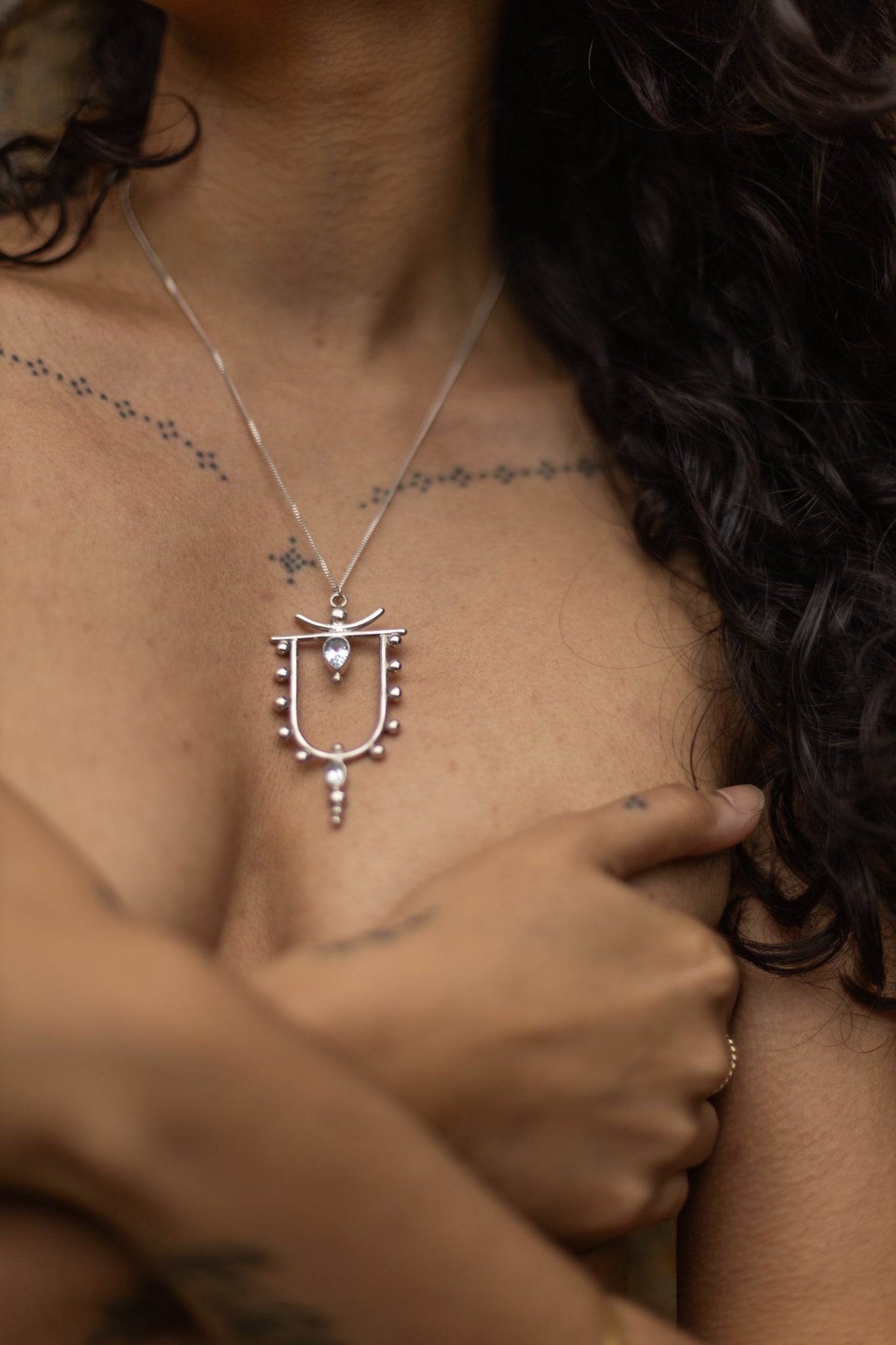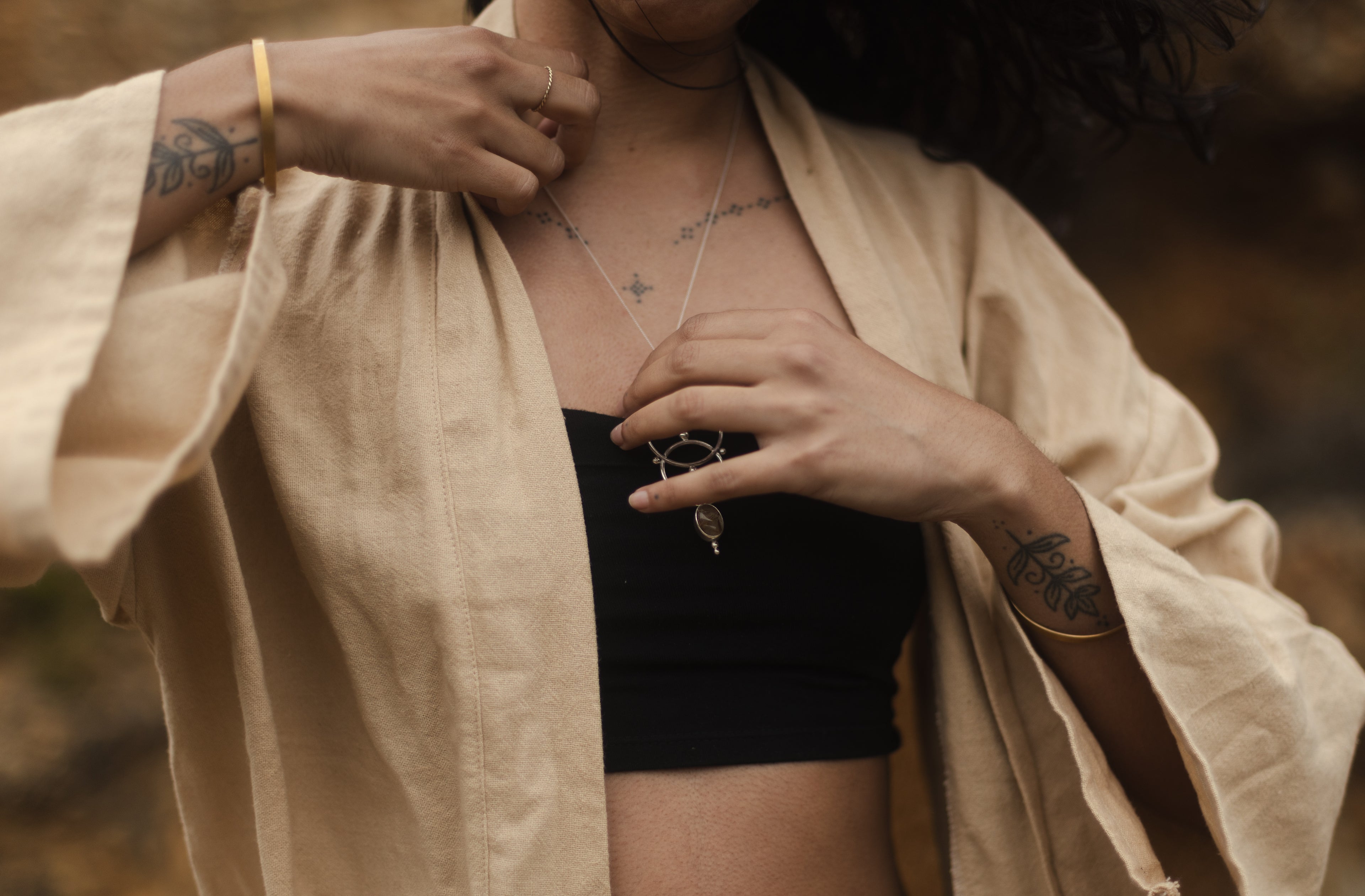 Each piece of the ORACLE collection is handcrafted in brass, sterling silver or gold-plating with delicate gemstones, creating a luxurious statement necklace reminding the wearer of their inner ORACLE and divine wisdom, connecting them to the ethereal forces guiding nature and spirit.