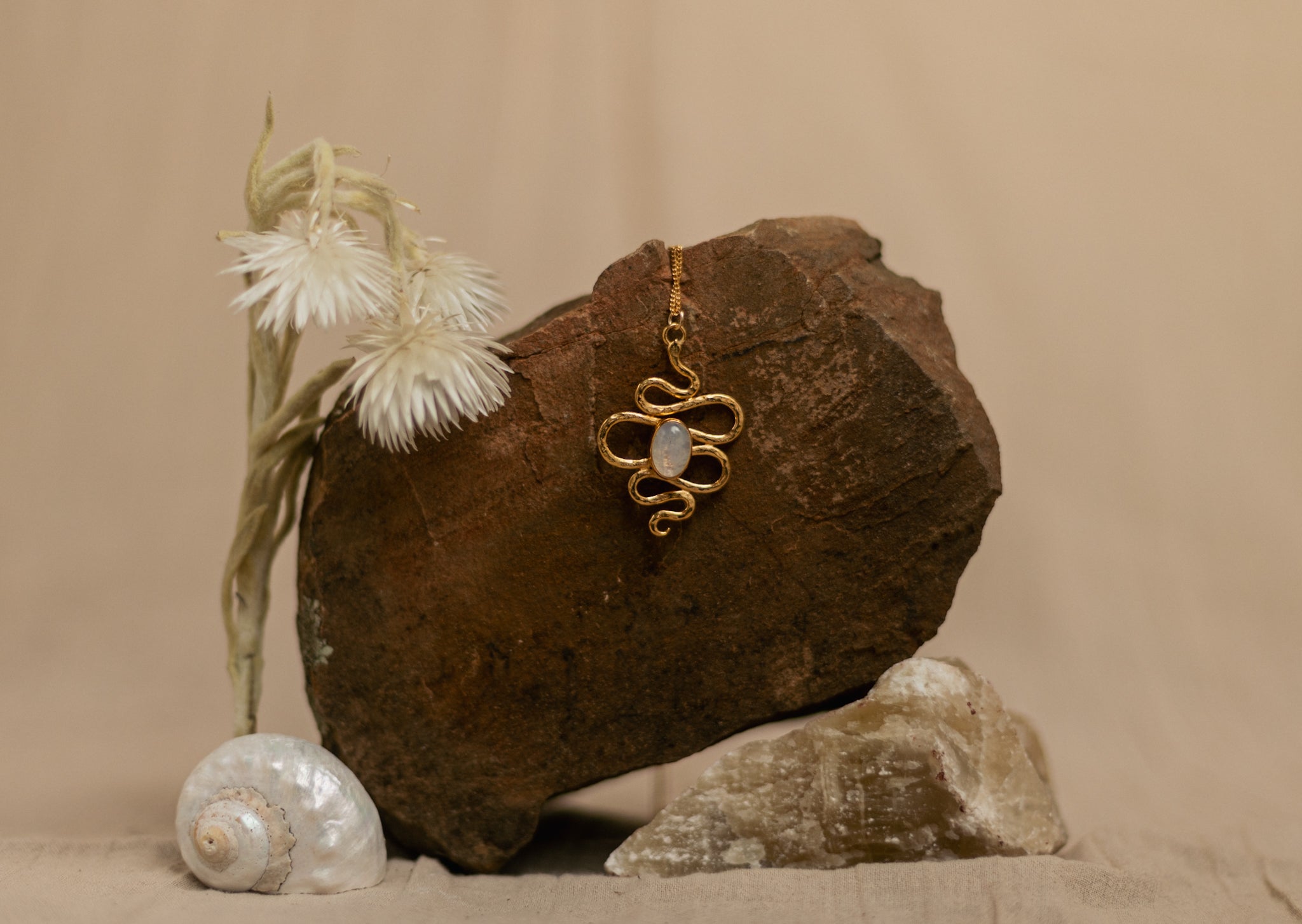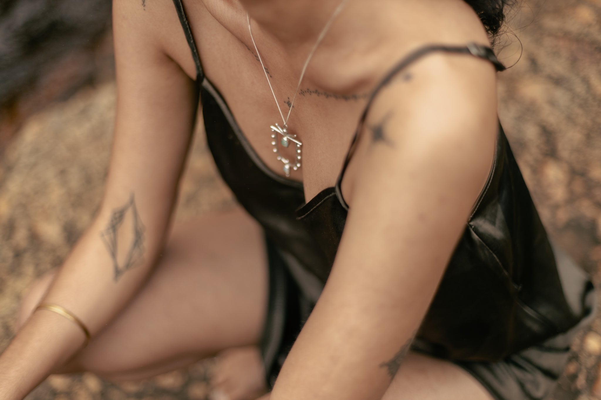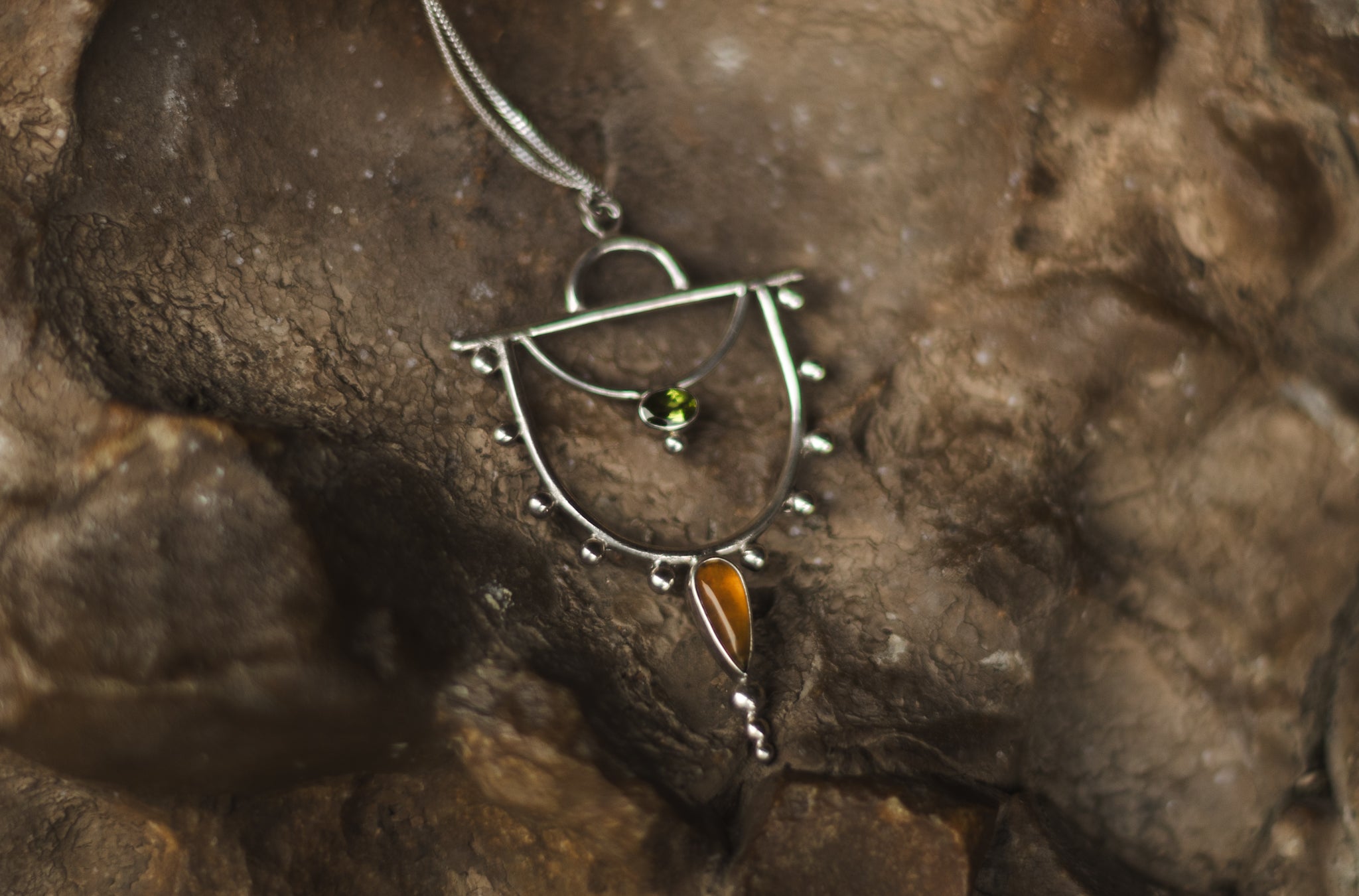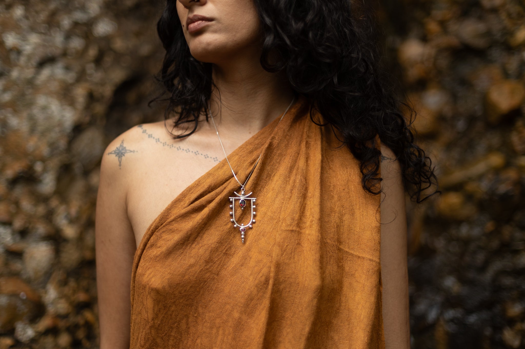 Each piece of the ORACLE collection is handcrafted in brass, sterling silver or gold-plating with delicate gemstones, creating a luxurious statement necklace reminding the wearer of their inner ORACLE and divine wisdom, connecting them to the ethereal forces guiding nature and spirit.