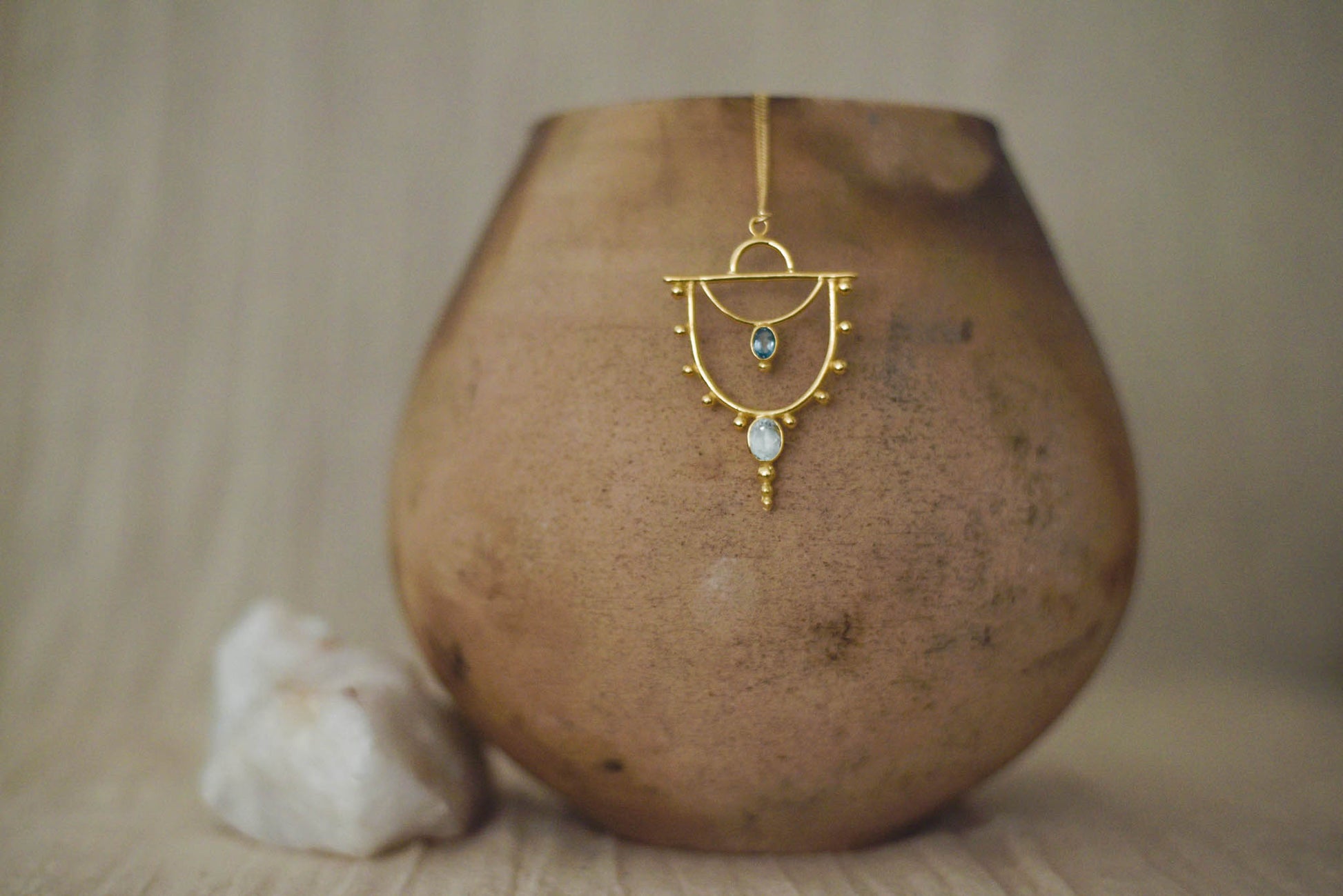 Each piece of the Oracle Collection is handcrafted in brass, sterling silver or gold-plating with high-quality gemstones. We have created a luxurious statement necklace that reminds the wearer of their inner Oracle whilst connecting them to the ethereal forces guiding nature and the cosmos.